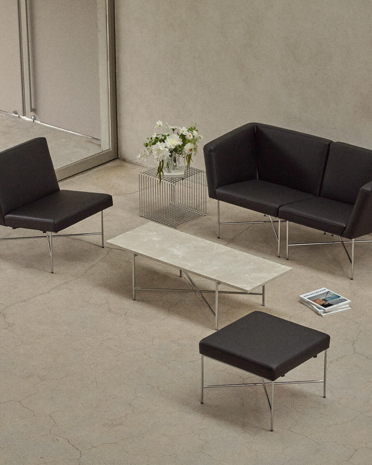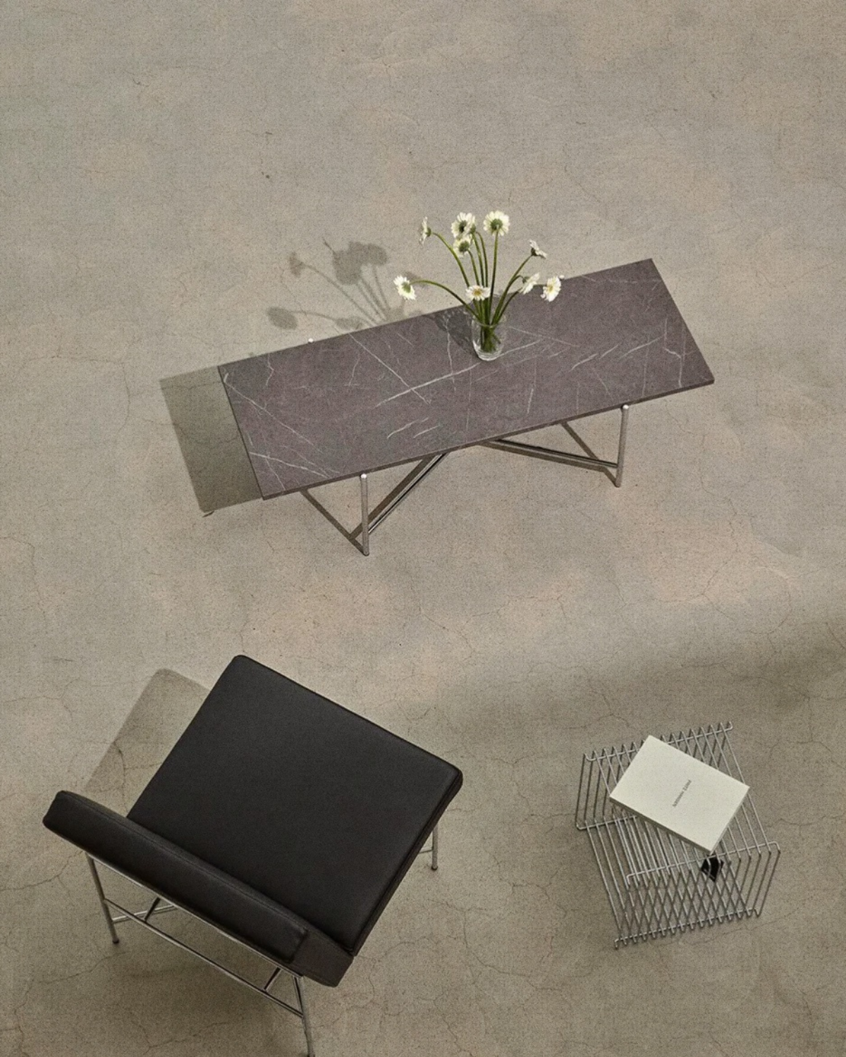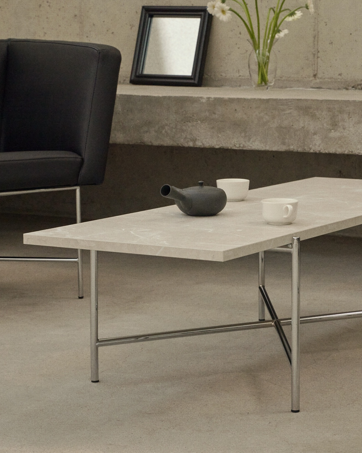 輝きのあるスチールと、どっしりとした大理石のような質感のパネルが対照的に組み合わさり、互いを引き立てながら調和。空間に確かな重みを与え、自然でありながら洗練されたムードを生み出します。