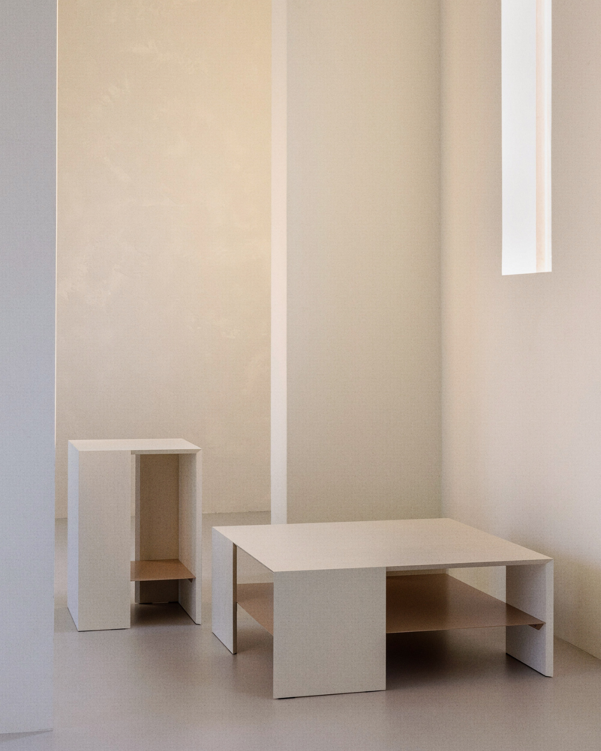 繊細でエレガントなフォルムに仕上げた Kante Sofa Table。
