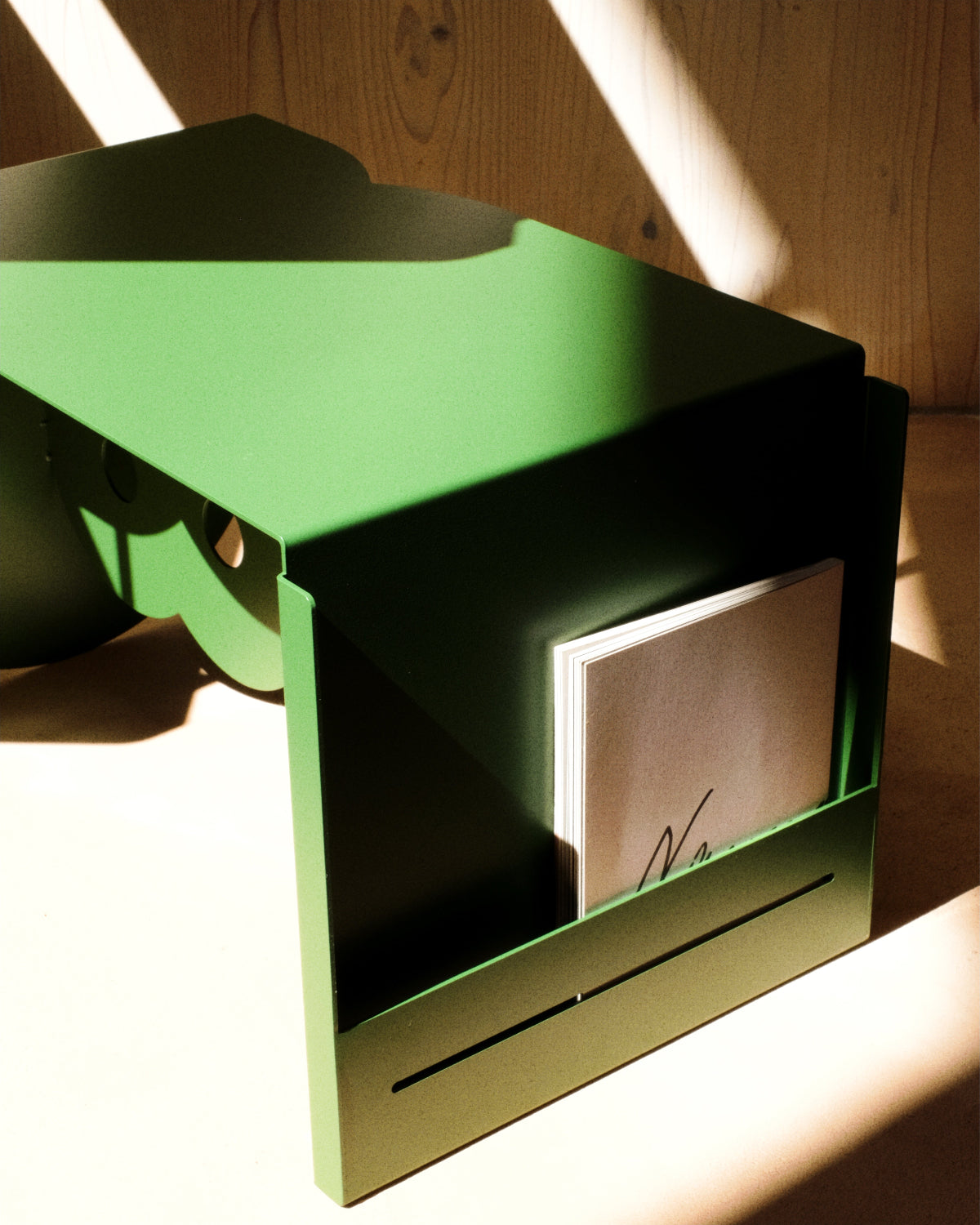 折り紙を想起させる板金技術から生まれた立体的な構造は、角度によって表情が移ろい空間に奥行きを与えます。