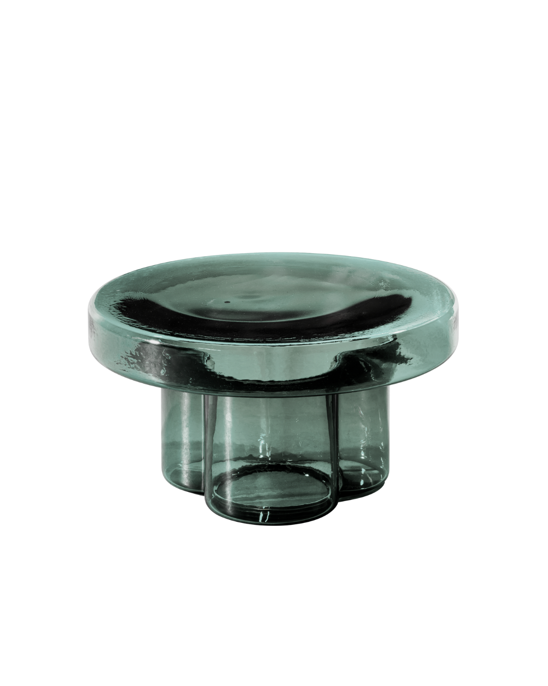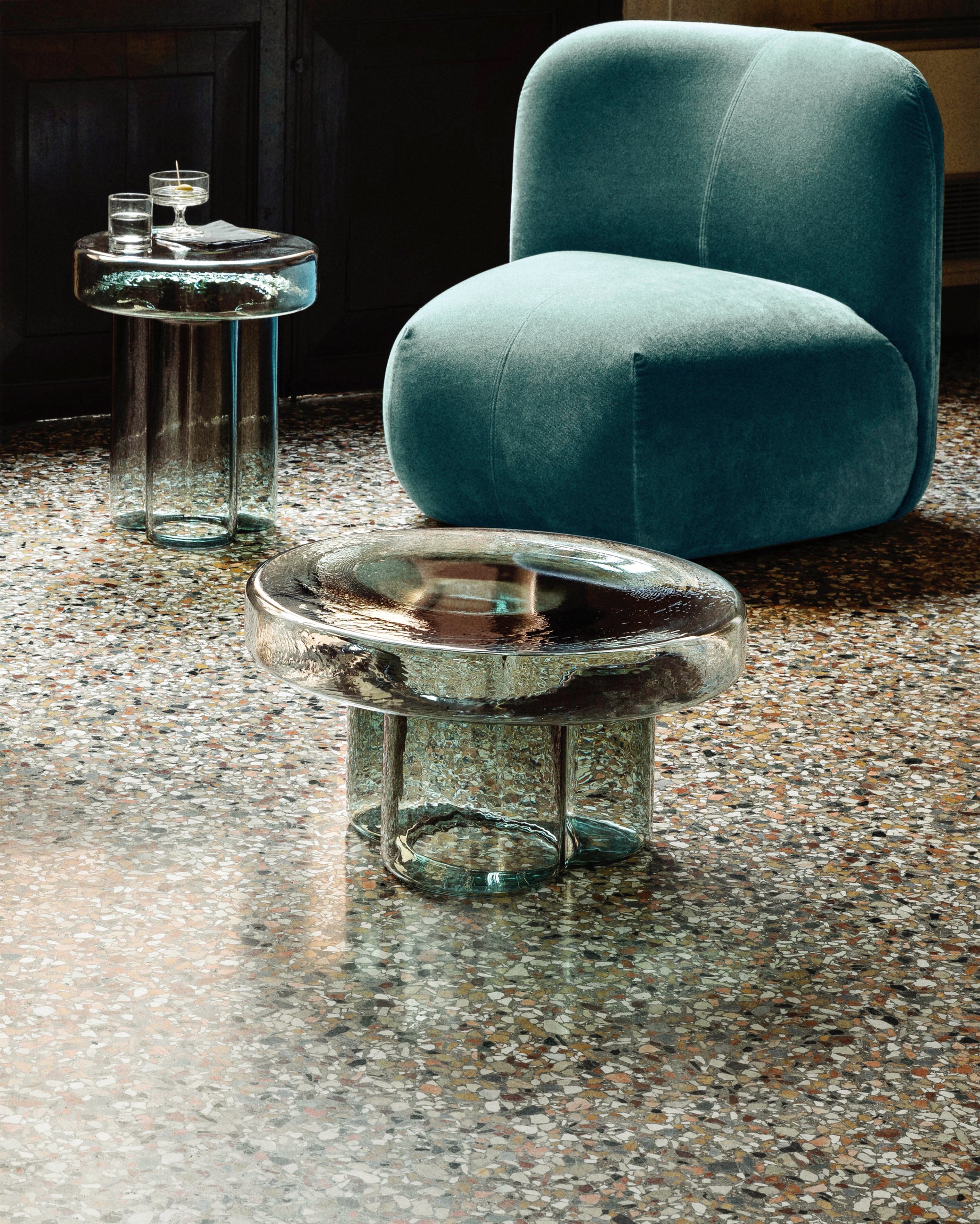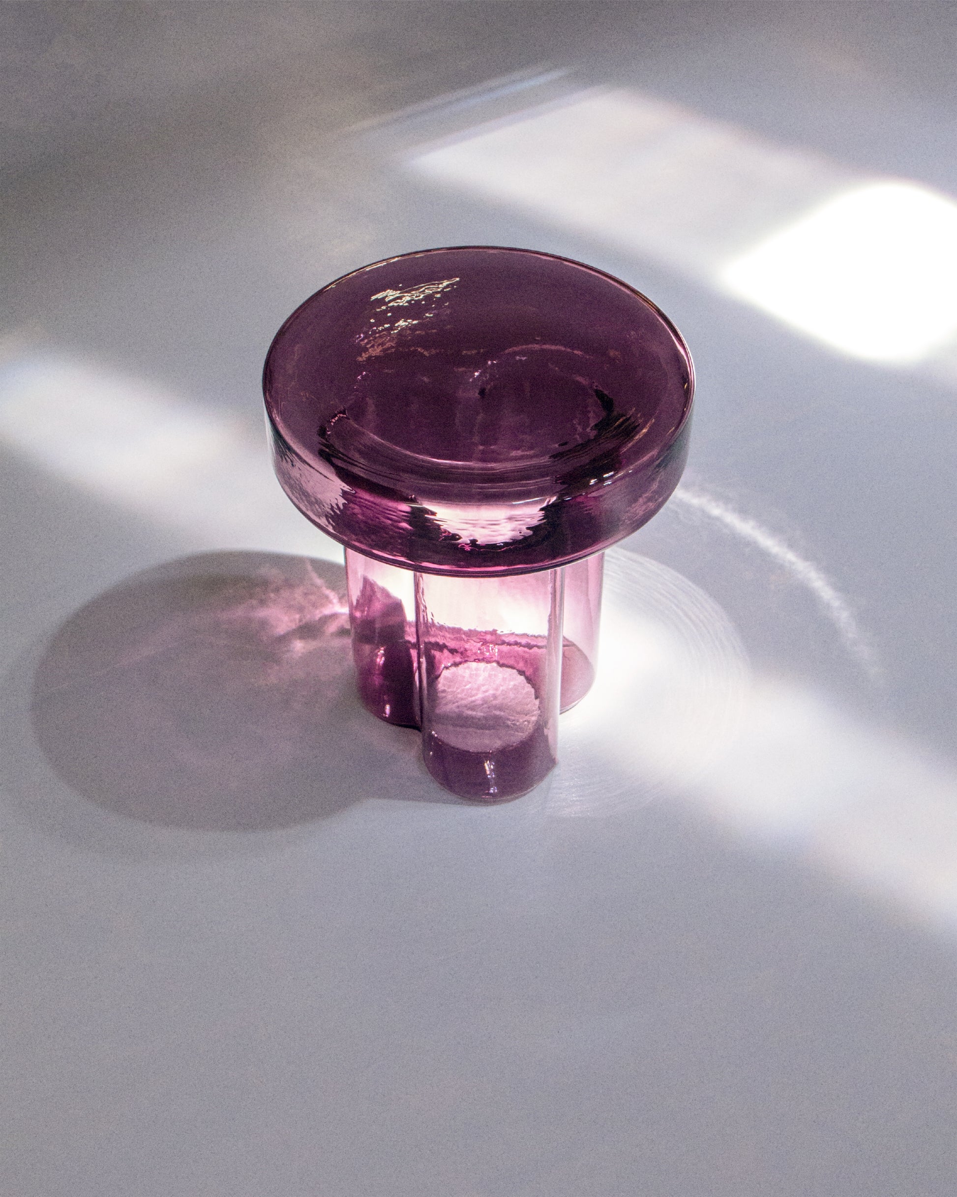 ひっくり返して吹き込まれた空気の一吹きから誕生したガラスのテーブル