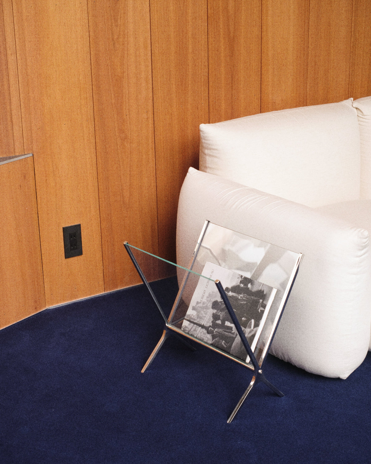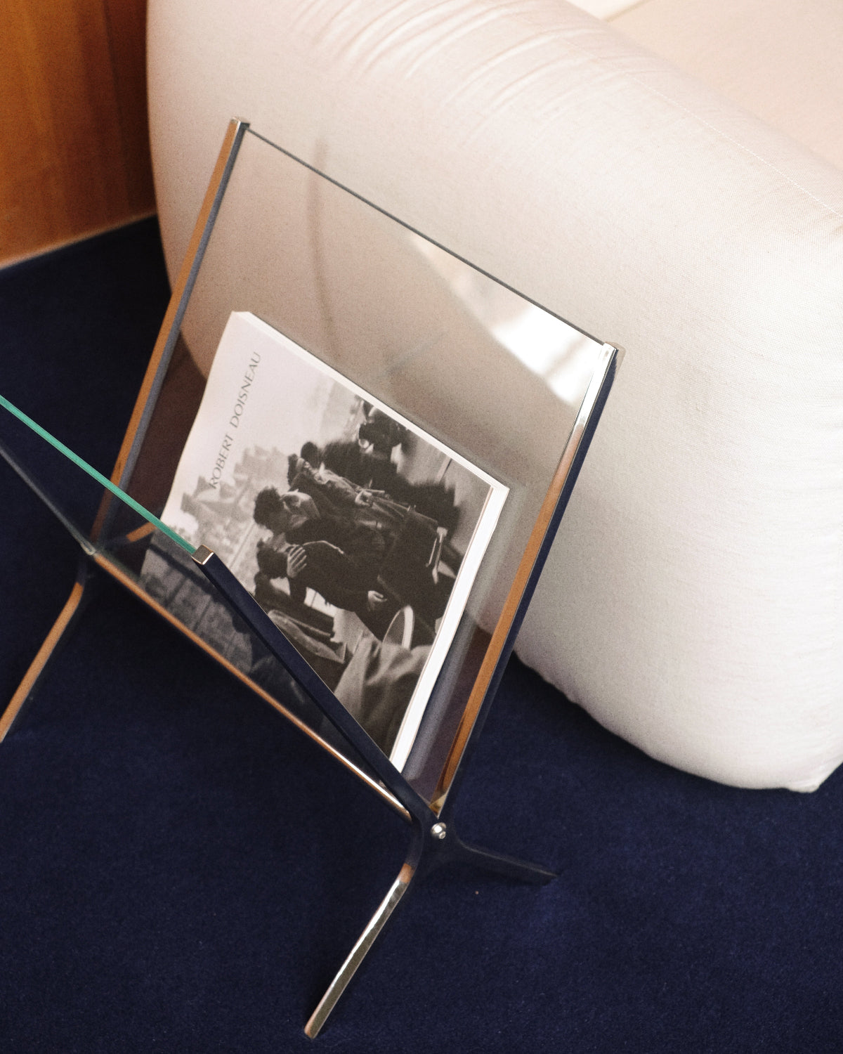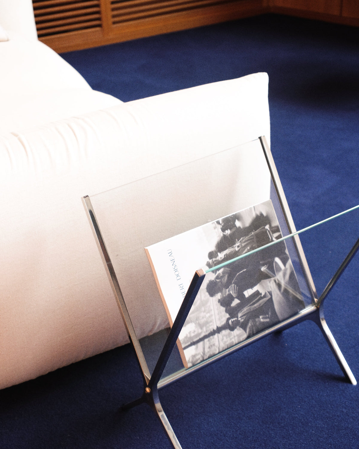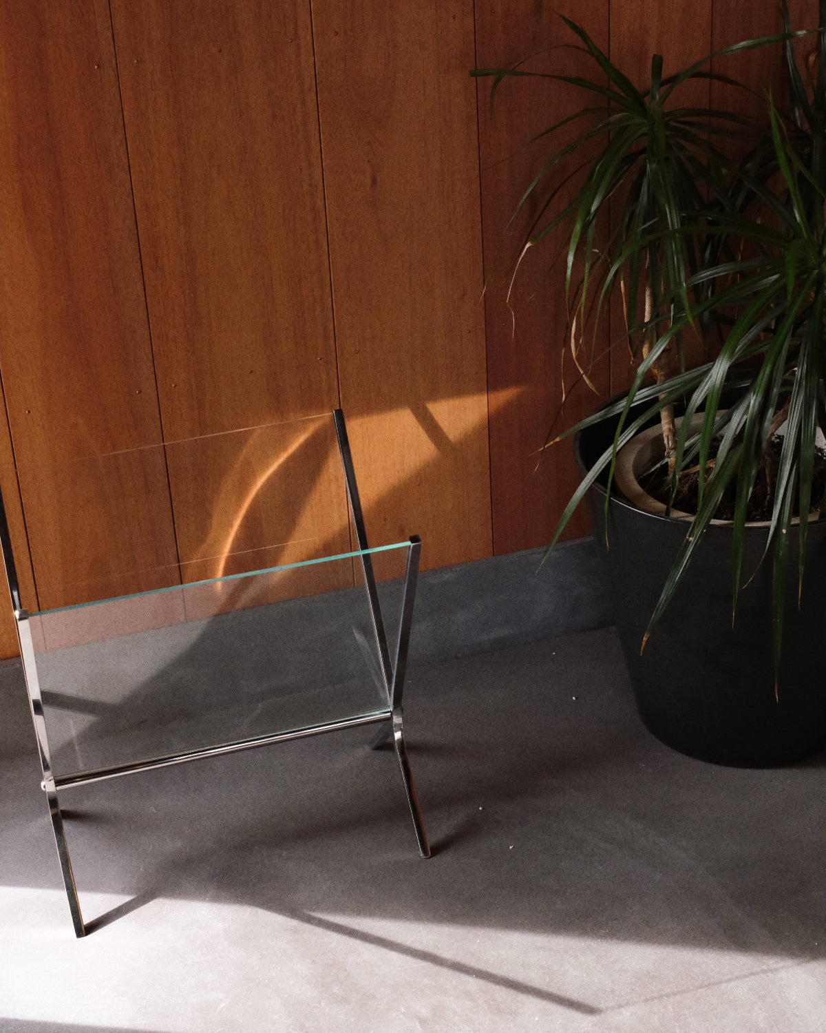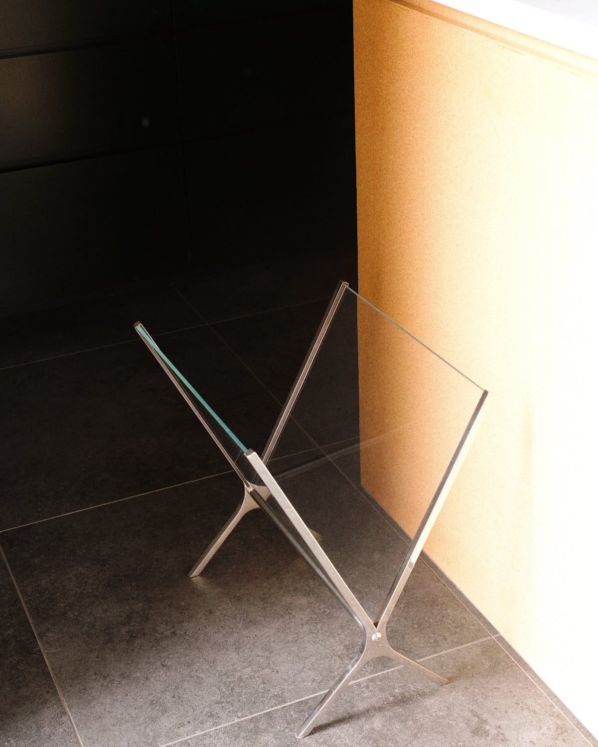 X型に配置されたステンレスにガラス面がはめられた控えめな印象のラック